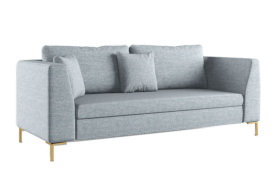 Строгая геометрия, прямые линии, универсальный светло-серый оттенок обивки подойдут под большинство интерьерных стилей. Изюминка модели — скошенные боковины и металлические ножки под золото.